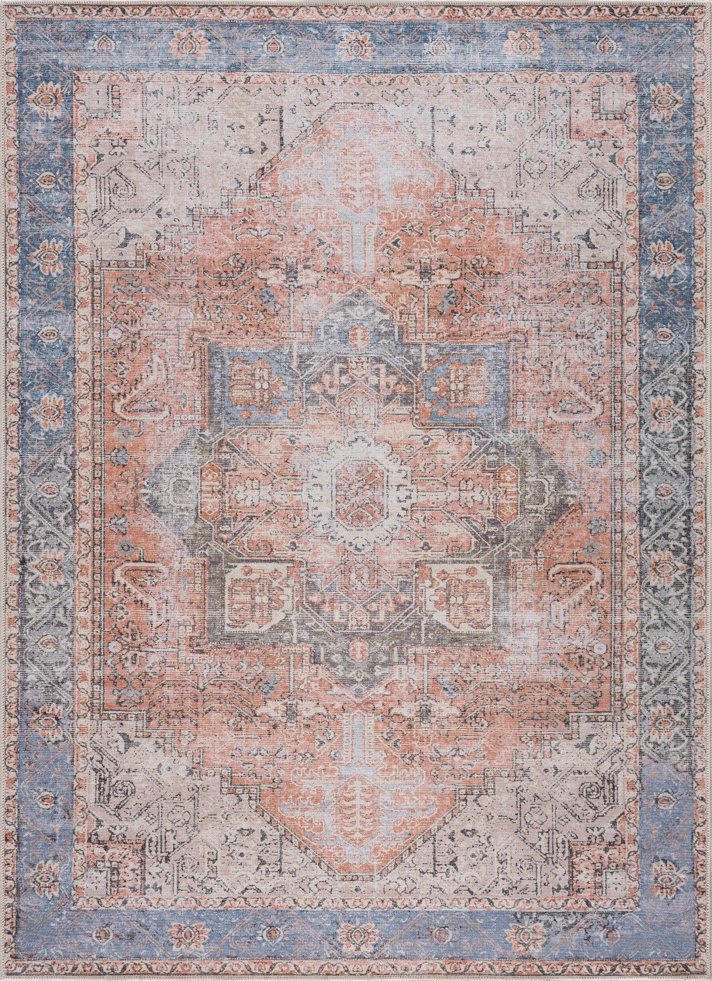 About: The composition of red, orange, and blue has been infused into this astonishing vintage rug to create a pronounced texture in your space. Besides the rich color palette, its pet-friendly and washable structure will please you more than ever.