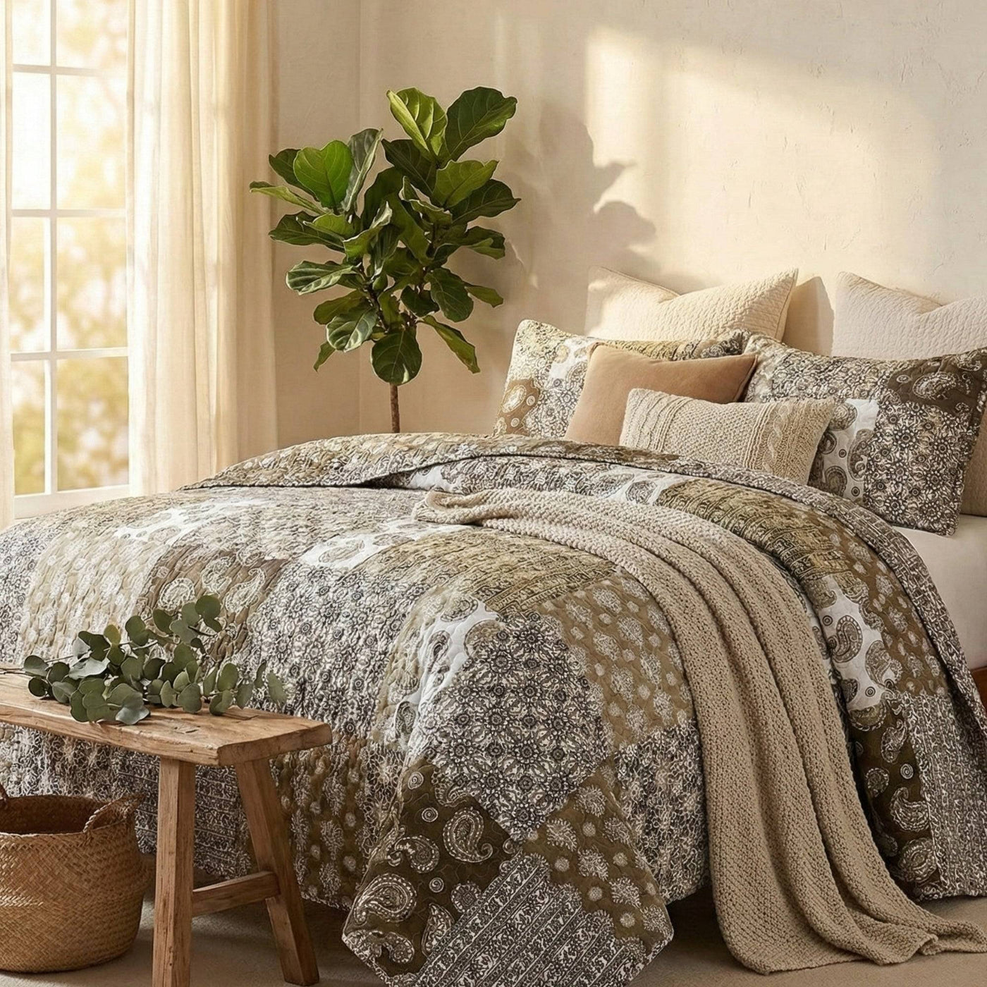 Backside of the Bedspread is a paisley olive + brown floral background to simplify the bedspread.