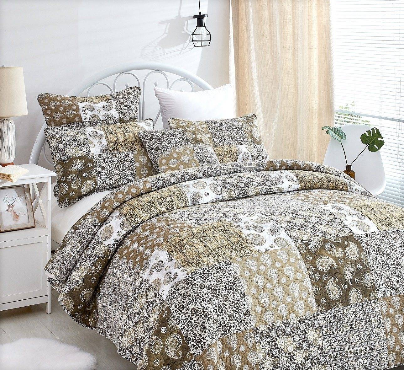 - DaDa Bedding Bohemian Olive Brown Moroccan Paisley Floral Filigree Patchwork Cotton Bedspread Set (JHW-885)