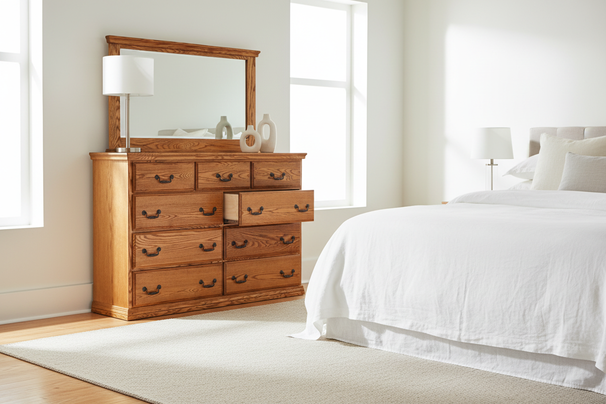Oak is renowned for its strength, durability, and distinctive grain patterns that add character to any bedroom. The prominent grain creates visual interest, while the dense hardwood ensures this dresser will support heavy loads daily for generations. Each piece is unique, with natural variations that make your furniture truly one-of-a-kind.