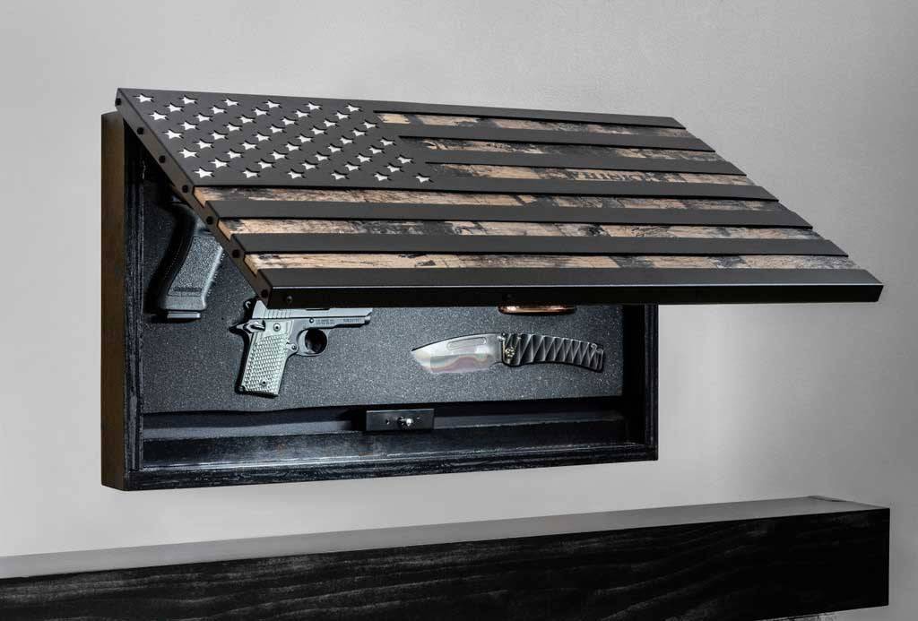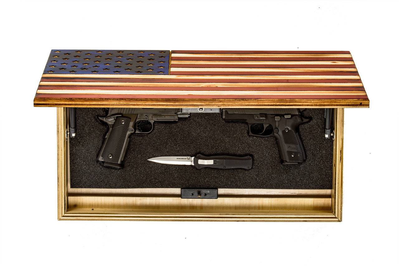 Behind the solid wood flag is a hidden trap door that has over 22 ½” X 10 ½” inches of interior space that quickly and easily conceals & locks your guns, magazines or even valuables in plain sight anywhere in your house.