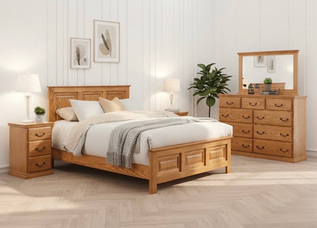 The Traditional solid oak bedroom set combines traditional craftsmanship with modern aesthetics. Its clean lines and rich finish make it a versatile addition to any bedroom decor.