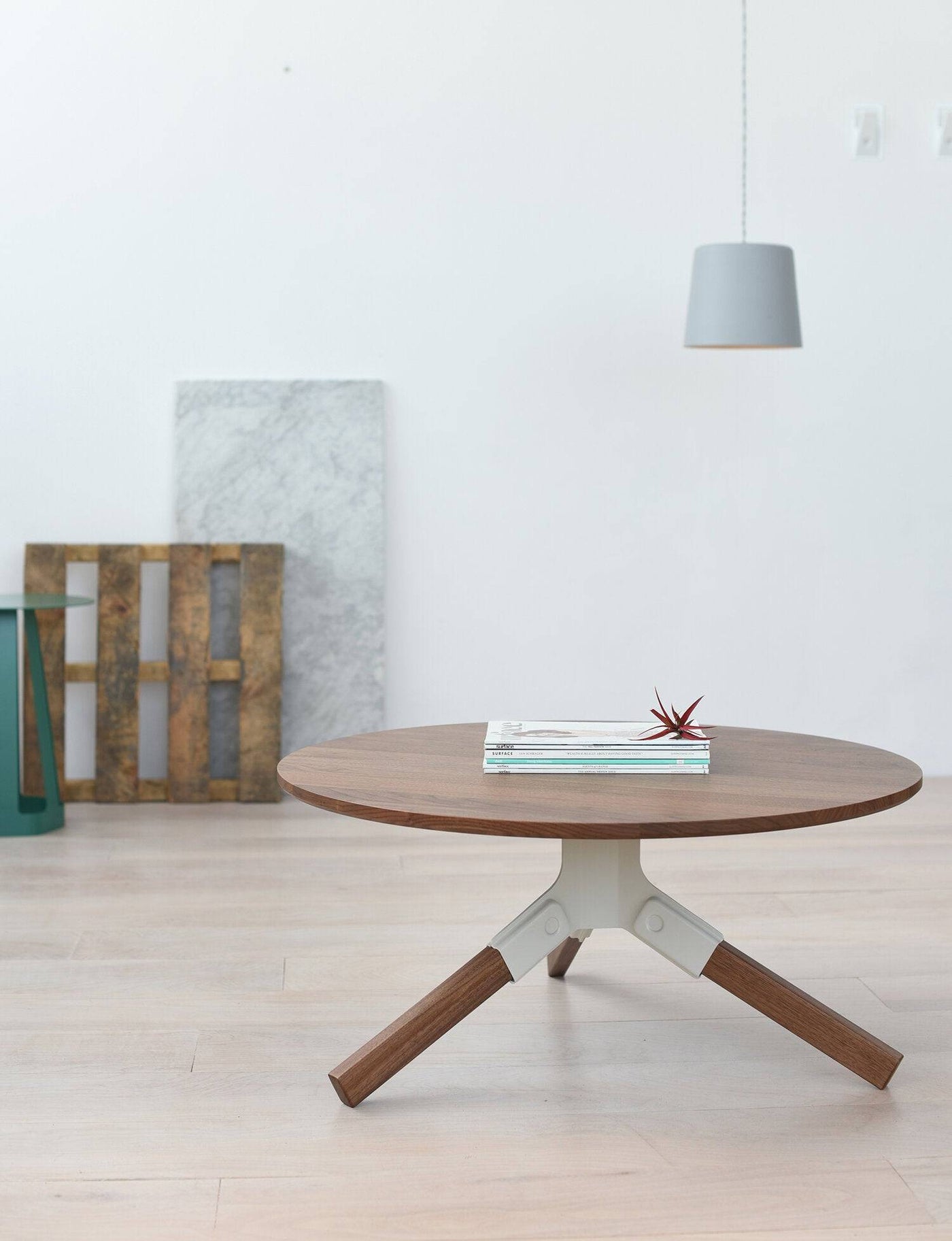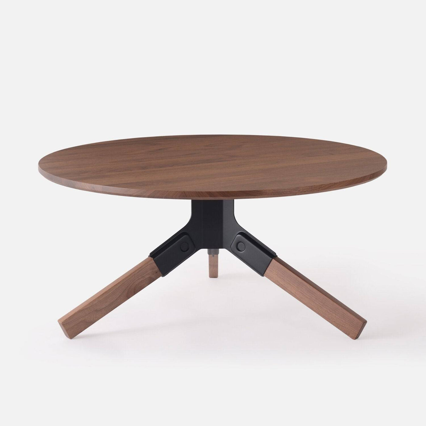 The Conrad coffee table has a stunning solid-walnut top and legs. Each wood leg effortlessly snaps into the stamped steel bracket. This detail gives the table its distinctive look, while simplifying the assembly process. The steel base is available in your choice of black or white. For custom colors, contact info@misewell.com