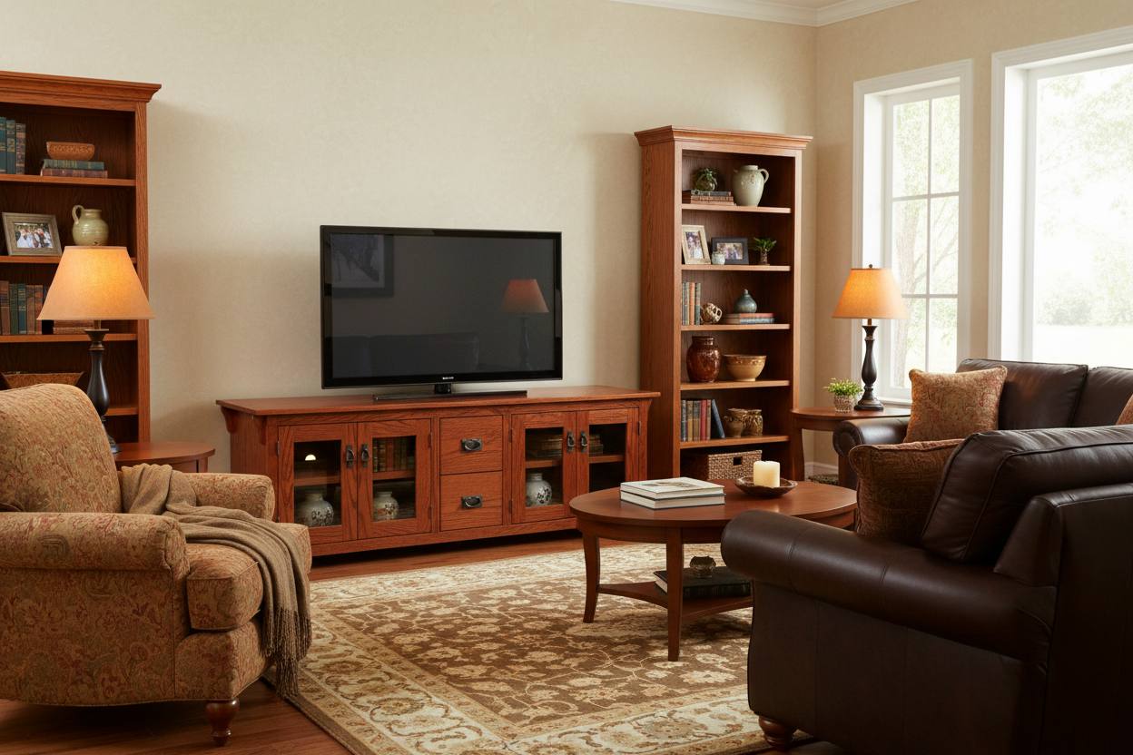 Mission Oak 64" TV Console. Features: Extreme simplicity and fine craftsmanship, along with straight-line Mission construction characteristics 1 open center cabinet with 1 adjustable shelf 2 cabinets with pocket-screwed framed glass doors, each with an adjustable shelf Wire management cutouts Mission-Style Vertical Cabinet Pull hardware Made in...
